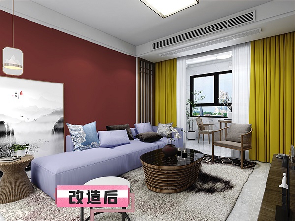 客廳牆面面積較大(da),更換牆面顔色對整體(ti)空間氛圍營(ying)造(zao)有(yǒu)明顯效果,但大(da)紅(hong)色的(de)彩度太高(gao),不宜長(zhang)期直視,可(kě)以(yi)刷上大(da)寶色号R8149-32A 紅(hong)棗,換上相近色的(de)窗簾,低彩調讓客廳更沉穩優(you)雅。